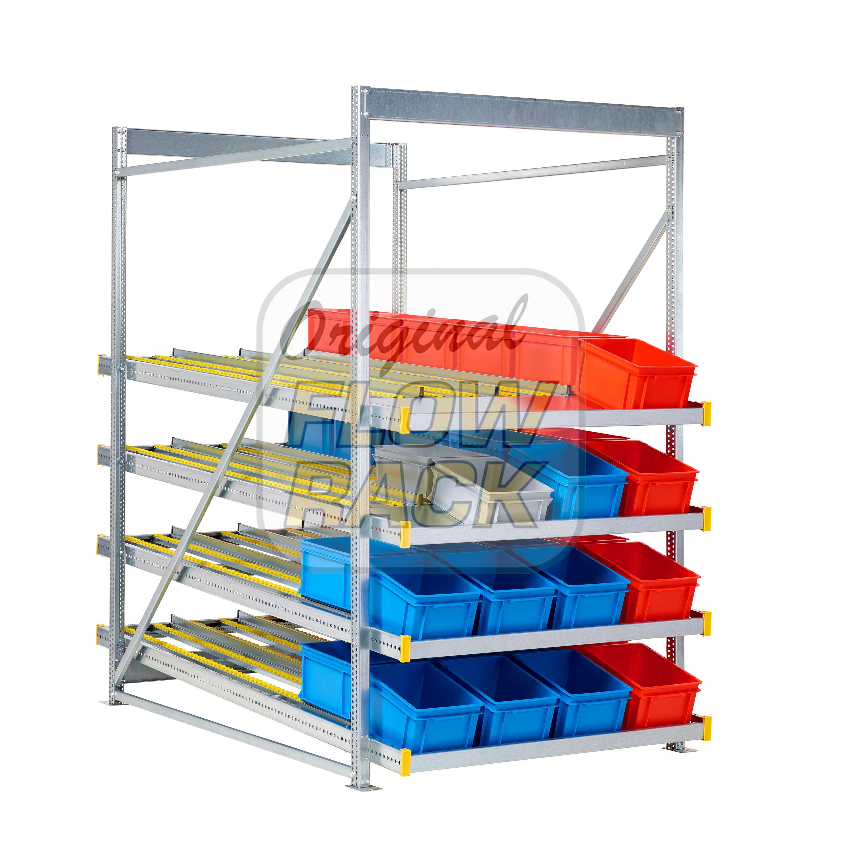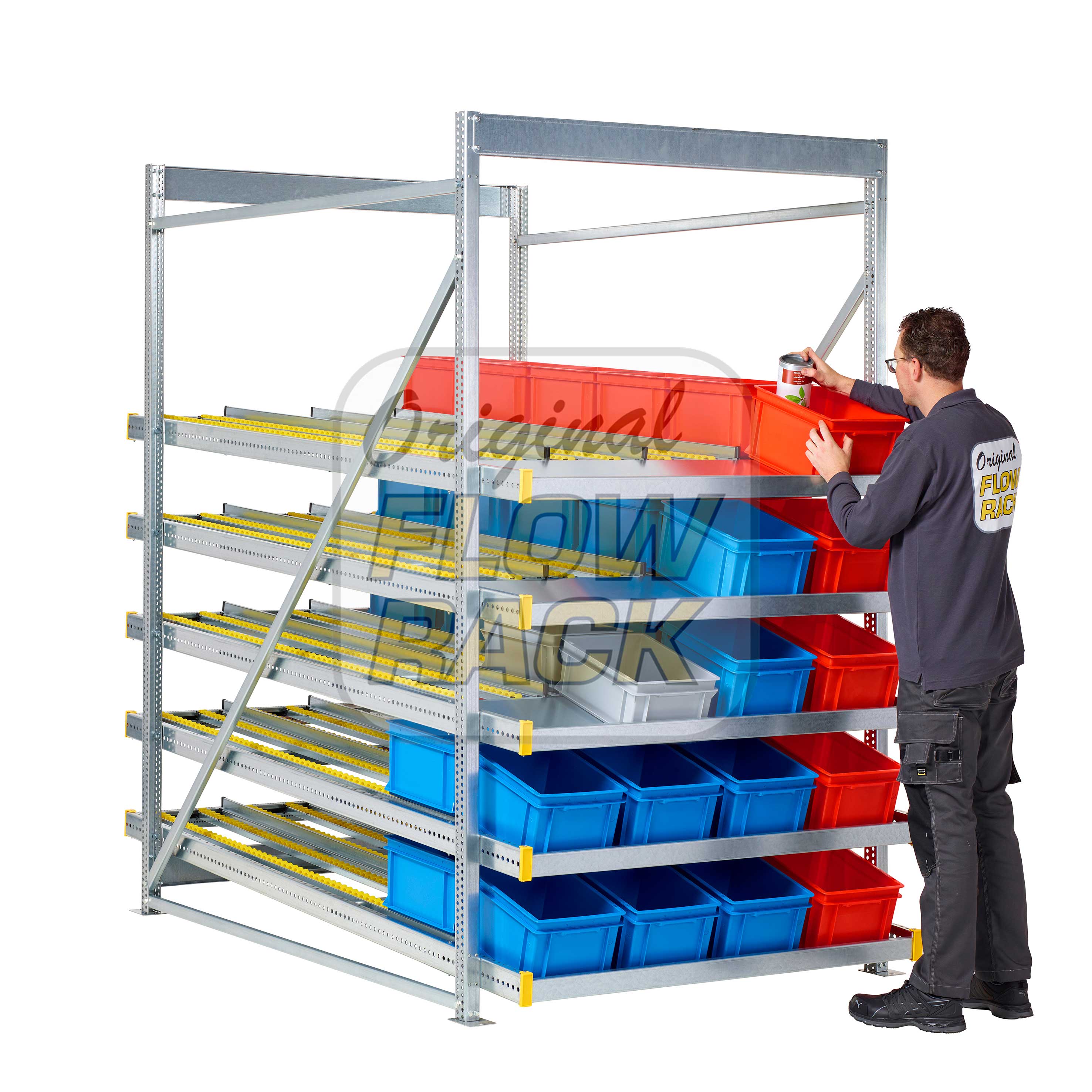 Bekijk hier voorbeelden van doorrolstellingen met een schuine uitgiftezijde. Zeer geschikt om losse artikelen uit omdoos of bak te picken. De eerste bak of doos staat extra schuin. Zo ontstaat veel grijpruimte boven de bak of doos: Grotere artikelen kunnen makkelijk uitgenomen worden en/of er kunnen meer niveaus boven elkaar gerealiseerd worden.